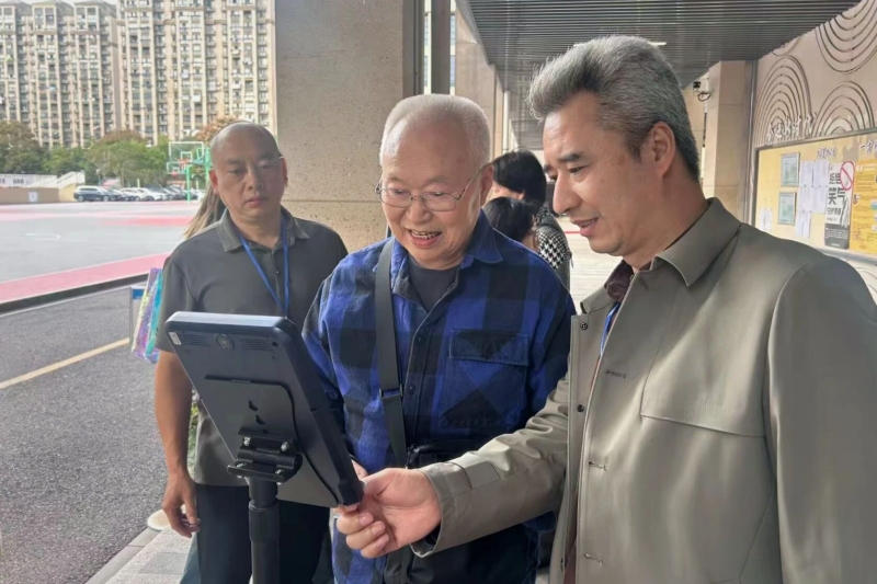 考生查看考场指引 宁波考点引导高龄考生安检入场